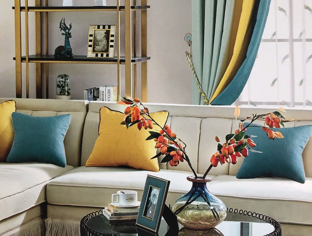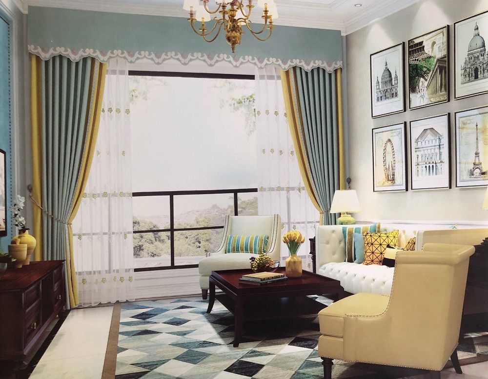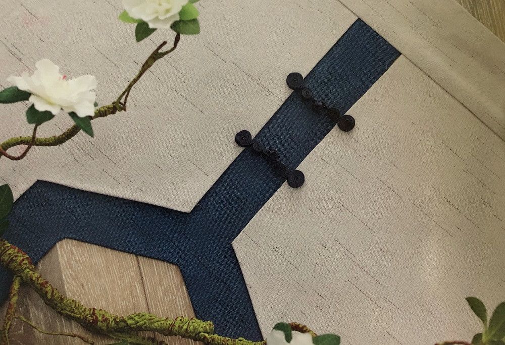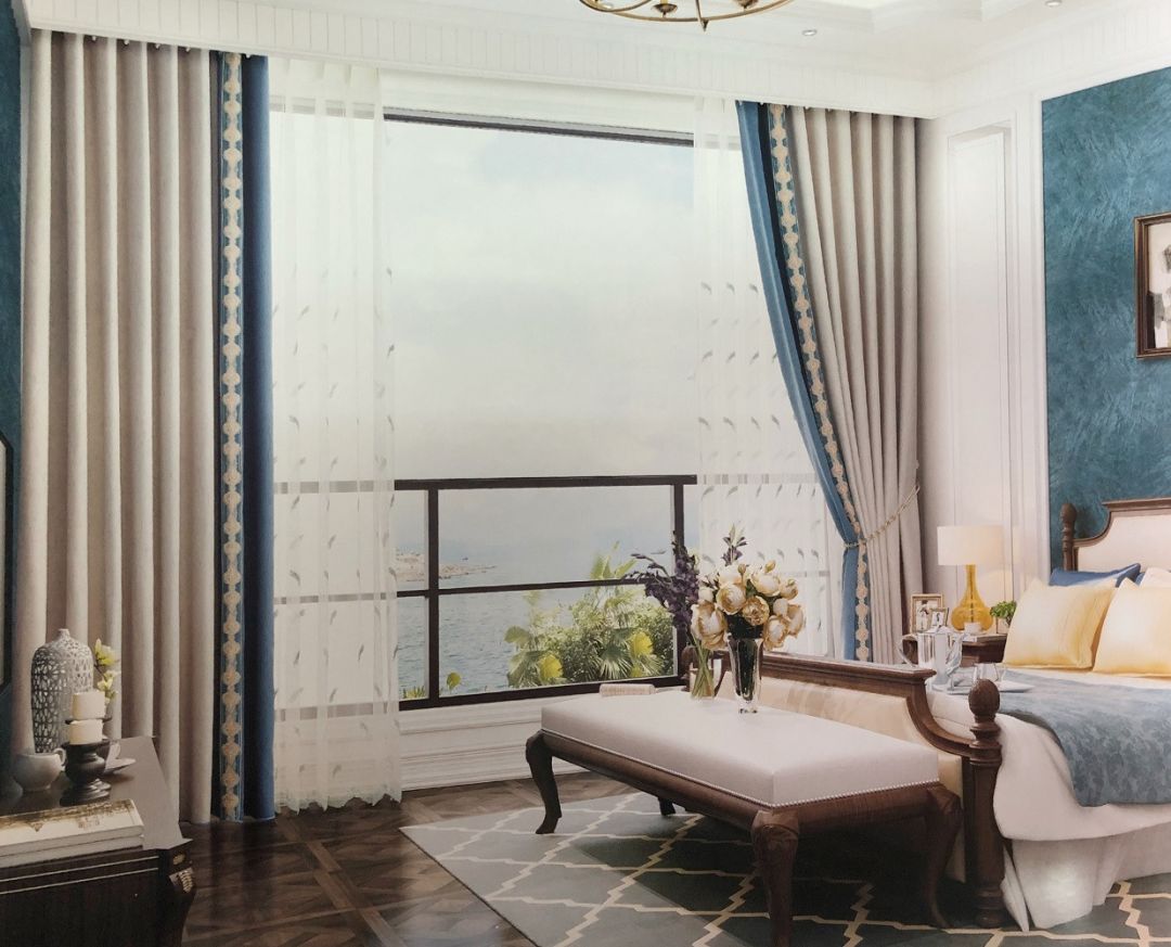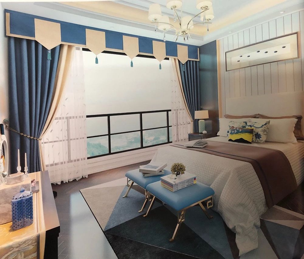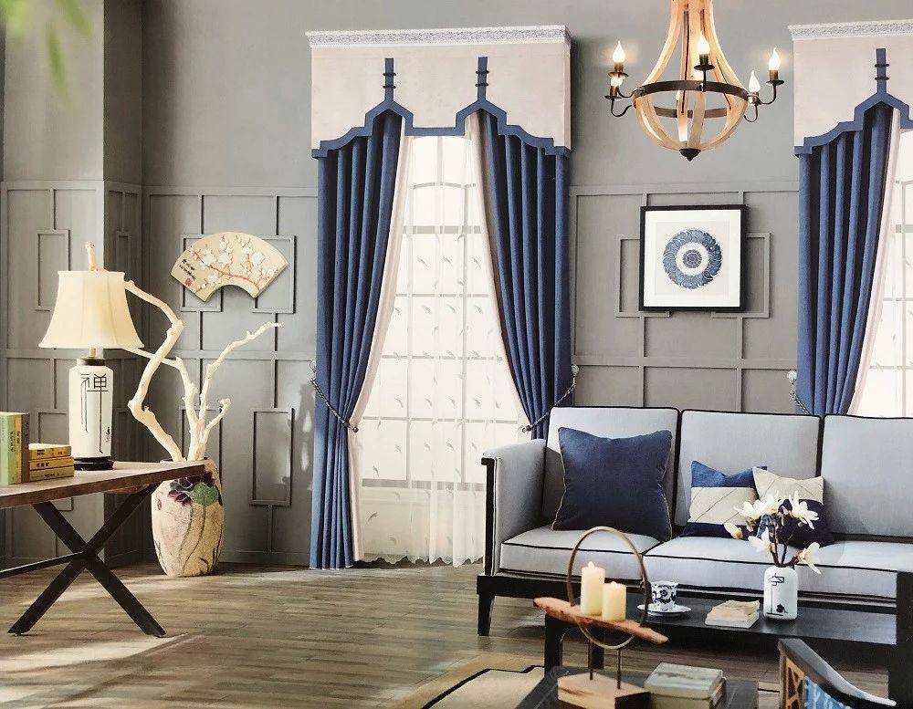 蓝+白,明朗清新,帘头点缀黑色盘扣,轻松变身简中风格。
