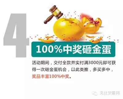 活动期间交付全款并实付满3000元即可获得一次砸金蛋机会,以此类推,多买多种,奖品丰富100%中奖