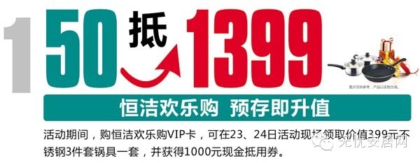 活动期间,购恒洁欢乐购VIP卡,可在23、24日活动现场领取价值399元不锈钢3件套锅具一套,并获得1000元现金抵用券。
