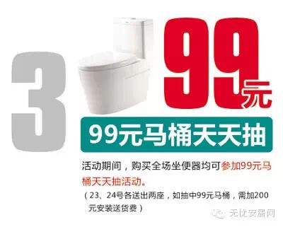活动期间,购买全场坐便器均可参与99元马桶天天抽活动(23.24日各送出两座,如抽中99元马桶需加200元安装送货费)